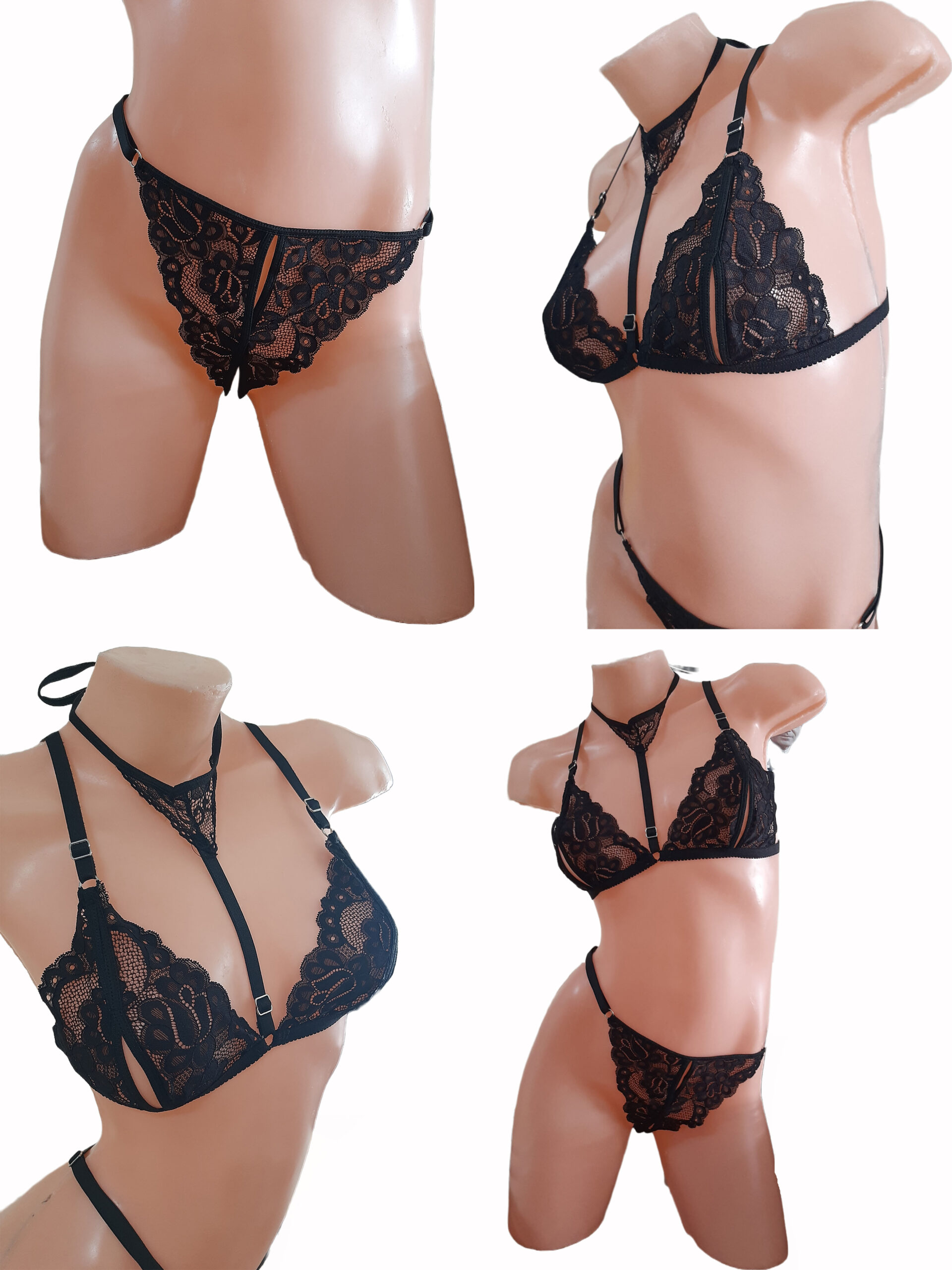 En puntilla con regulaciones – Con cuello, corpiño abierto y colaless abierta (rutera) disponible en talles del 85 al 120 y en colores Negro, Azul y Rojo.